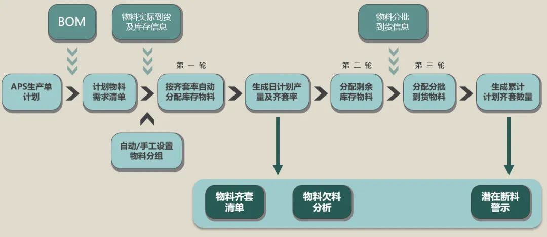 APS基于全面的物料供需智能匹配分析,可从根源上解决物料的自动分配难题。其基本思路是首先根据生产计划和BOM计算每个生产单每天的物料需求量,然后根据物料库存数量和物料分配规则计算分色分码的物料齐套情况,第一轮按齐套率和计划生产时间自动分配库存物料,第二轮分配剩余库存物料,第三轮分配在途物料。
