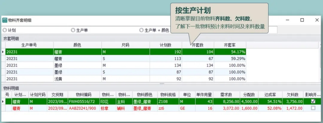 APS物料管理功能根据生产单物料到货情况和所选规则自动分配物料,计算每个生产单分色分码的物料齐套情况,用户在APS可视化排产面板上可直观看到各生产单的齐套率,并可查看每个生产单每种颜色每种尺码的物料齐套清单,我们只需重点关注近期计划生产但未齐料的部分。