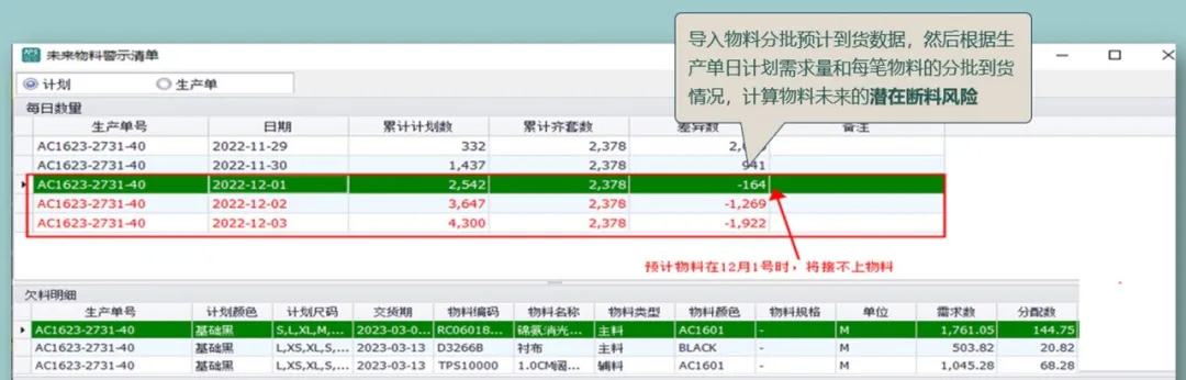 APS根据物料分批预计到货信息和生产单每天的物料需求用量,进行全面的物料供需智能匹配分析。基于当前生产计划,提醒哪个生产单有断料风险,并可追踪到哪个生产单哪天缺哪种物料,从不同维度(客户、款号、物料编码、计划、工厂、车间、跟单员等)掌握目前物料的欠料情况,从而实现以生产计划为驱动的科学物料跟催。