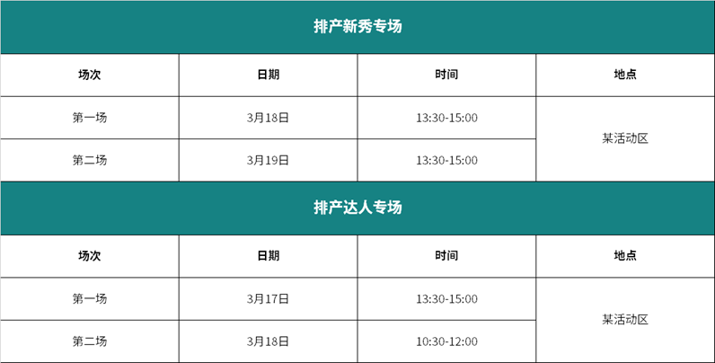 本届大赛分为『排产新秀』专场和『排产达人』专场。为鼓励更多在校学生参与到智能生产的浪潮中,『排产新秀』专场比赛报名仅面向在校学生;『排产达人』专场则面向除在校生外的所有到场观众。