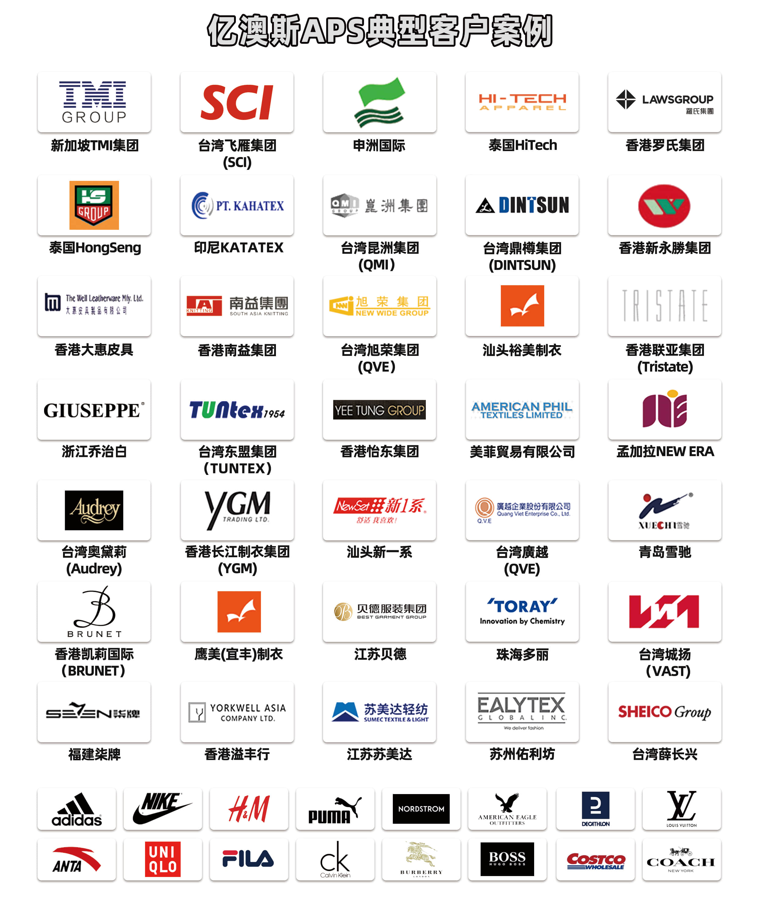广州亿澳斯软件股份有限公司(Integrated Optimization Software Co.,Ltd)成立于2007年,专注于纺织服装行业的智能排产系统(IOS-APS)研发,拥有世界顶级优化算法专家和17年以上跨国服装企业工作经验的专业顾问,自主掌握智能排产算法的核心技术,服务客户遍布全球十多个国家,包括Adidas、Nike、H&M、优衣库、迪卡侬等知名品牌商的顶级供应商。凭借成熟的产品和专业周到的服务能力,亿澳斯APS项目实施迄今保持100%上线成功率,给用户带来了很好的经济效益,也因此在业界拥有极佳的口碑。