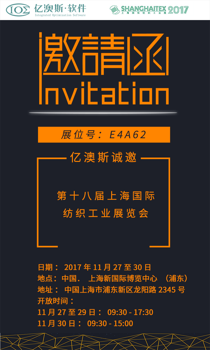 第十八届上海国际纺织工业展览会将于2017年11月27日至11月30日在上海举行。届时将有1200多家参展商参与本届盛会,吸引超过80个国家和地区的逾6万参观者。广州亿澳斯软件股份有限公司将在E4A62展位,欢迎您的到来!