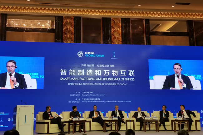 “智能制造和万物互联”财富分论坛由《财富》杂志执行主编亚当·拉辛斯基主持,在对话环节,爱立信总裁兼CEO鲍毅康、库卡机器人CEO蒂尔·劳伊特、麦肯锡合伙人谭永超、正威集团董事长王文银、柯尼卡美能达总裁兼CEO山名昌卫、雪松集团董事长张劲等六位嘉宾展开了热烈的讨论,从不同的角度描绘出“未来工厂”的场景,制造业不但要实现自动化,还需要实现管理过程数字化和智能化,才能让供应链的效率更高、信息的处理更快,最终的目的是实现企业的效益最大化。