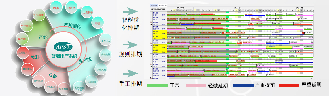 在可视化排产器上用户通过鼠标的拖拉动作可以轻松实现常用的排产操作,如移单、插单、拆单、合单等等。 用各种颜色表示订单满足客户交期的各种状态,如红色表示严重延期,蓝色表示严重提前等等。另外亿澳斯APS还提供生产单变更处理功能,使已排生产单计划与更新的生产单信息及时保持同步。以上这些功能确保排产人员可以轻松制订高质量的生产排程方案。