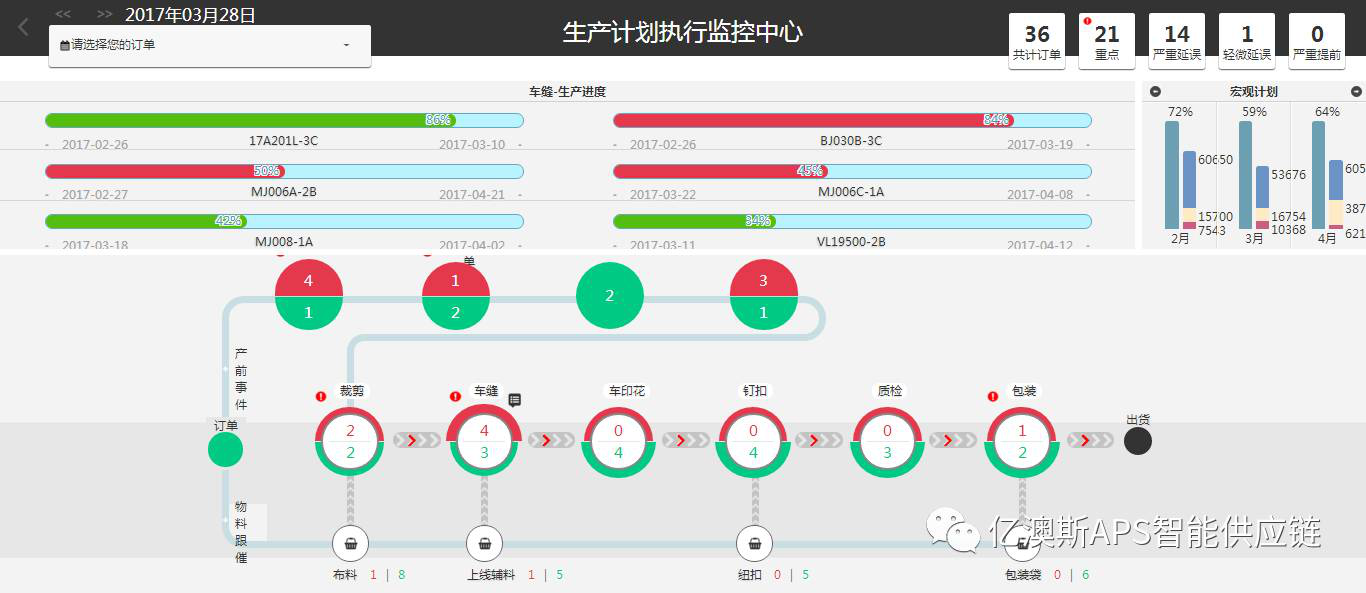 车缝进度、产前关键事件进度,非车缝工序进度以及物料采购进度都可以通过系统对接或手工输入的方式采集,这些进度对生产计划的影响在可视化排产器上以颜色或图标的形式直观呈现,同时显示在任务提醒面板并可查看其详细信息,以便及时采取有效的措施。