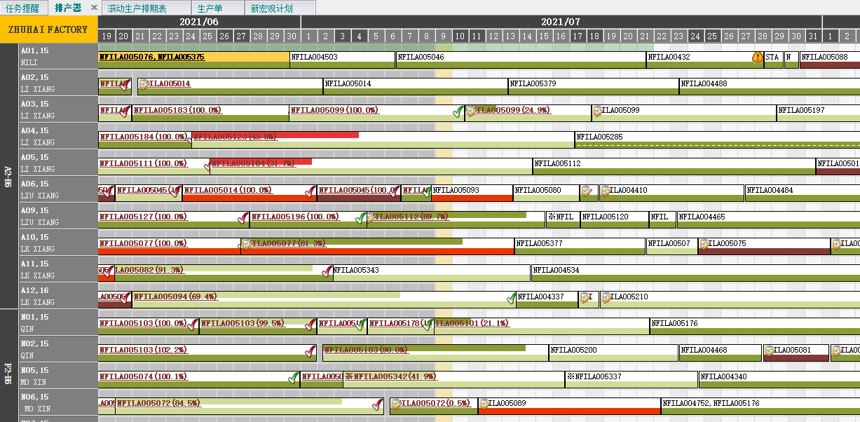 在可视化排产器上用户通过鼠标的拖拉动作可以轻松实现常用的排产操作,如移单、插单、拆单、合单等等。 用各种颜色表示订单满足客户交期的各种状态,如红色表示严重延期,蓝色表示严重提前等等。另外亿澳斯APS还提供生产单变更处理功能,使已排生产单计划与更新的生产单信息及时保持同步。以上这些功能确保排产人员可以轻松制订高质量的生产排程方案。