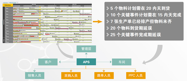 亿澳斯APS系统能够有机地把生产计划与物料、产前事件关联起来,准确计算出物料需求的时间,自动对每个物料和产前事件进行跟踪记录,并对异常的事件时实预警,通过邮件、短信、仪表盘等方式通知相关人员快速处理,从根本上减少因物料、产前事件所造成的交货延误。